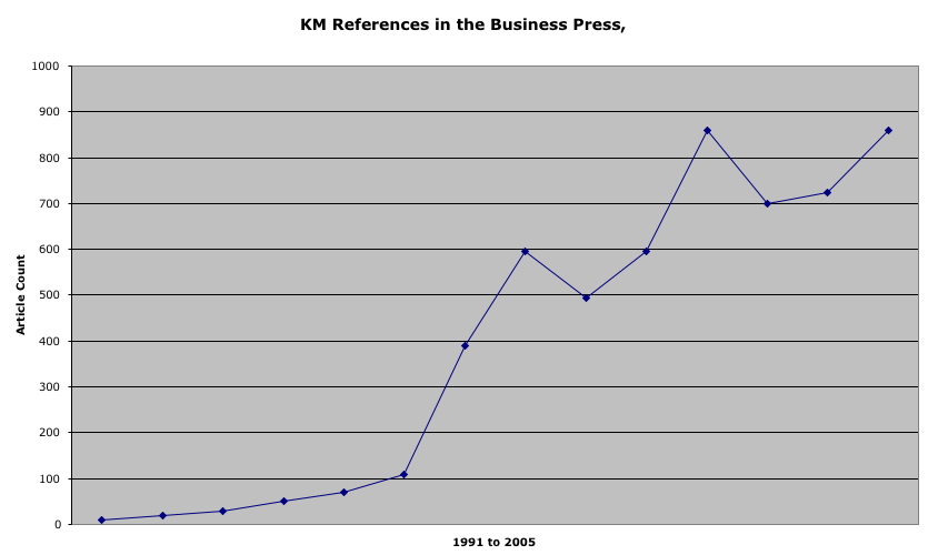 KM by contrast, takes off slowly, launches with the tech bubble in 1999, settles a bit, and grows steadily between 2000 and 2005 with a spike in 2002.