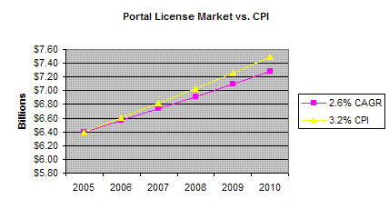 BEA's State of the Portal Market 2006 in Portals Magazine cites a Gartner study stating $6.4 Billion in 2005 software license revenues and an estimated 2.6% Compound Annual Growth Rate (CAGR) through 2010.