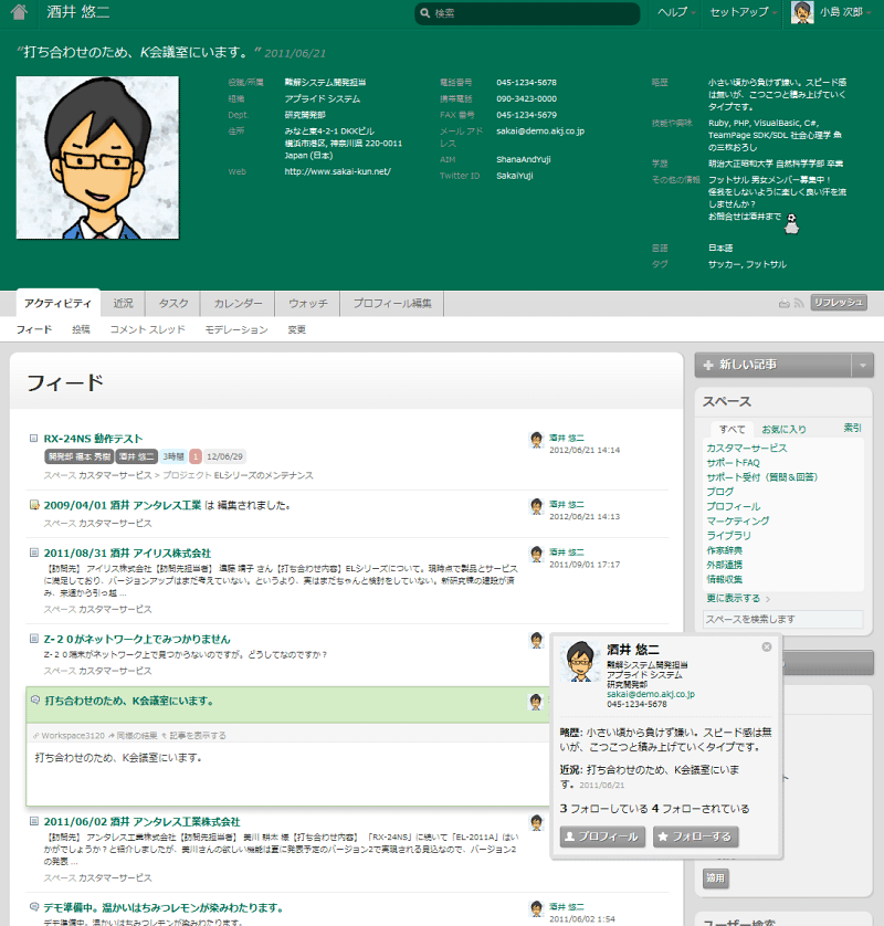 Twitter スタイルのフォロー モデルは、シームレスに検索やプロフィールと統合されています。TeamPage の複数から成るスペース モデルにより、閲覧者の権限を適用して、近況を伝える相手を特定のスペースだけに限ったり全体に広げたりできます。 プロフィール ページには、連絡先情報、興味関心、近況、そしてアクティビティのタイムラインが、自動的に閲覧者の権限が適用されて表示されます。 その他のページでは、投稿者や編集者の名前をクリックして簡易プロフィールを表示し、連絡先や近況を確認できます。 アクティビティのタイムライン画面(フィード画面)では、クリックひとつで記事を展開してその場で内容を読め、さらにタスクやコメントの追加など、アクションを登録できます。 詳しくは、仕事に役立つソーシャル機能 をご覧ください。 |