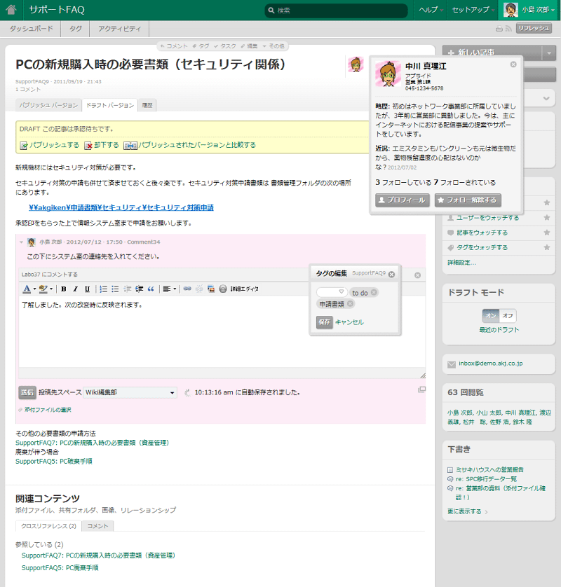 TeamPage は、Wiki スタイルのコラボレーション編集、タイムライン表示、段落単位のタグやコメントやタスクの追加などの機能をシームレスに統合しています。TeamPage のスペースは、仕事に必要な様々な情報(コンテキスト)と権限設定がひとつにまとめられたコラボレーション スペースです。 モデレーション機能は、一般公開する情報はそのままにしておきつつ、特定のグループだけで編集し、承認によって公開する運用を可能にします。 リンクされた記事は、権限を反映したリレーションシップでお互いに結ばれます。つまり、権限がリンクにも自動的に反映され、読める情報は閲覧権限のあるものだけに制限されます。 通知メールへの返信は、元の記事のコメントとして投稿されます。Outlook などのメール ソフトを中心としたビジネス スタイルにも対応できます。 詳しくは、ハイパーテキストで仕事をつなげる をご覧ください。 |
