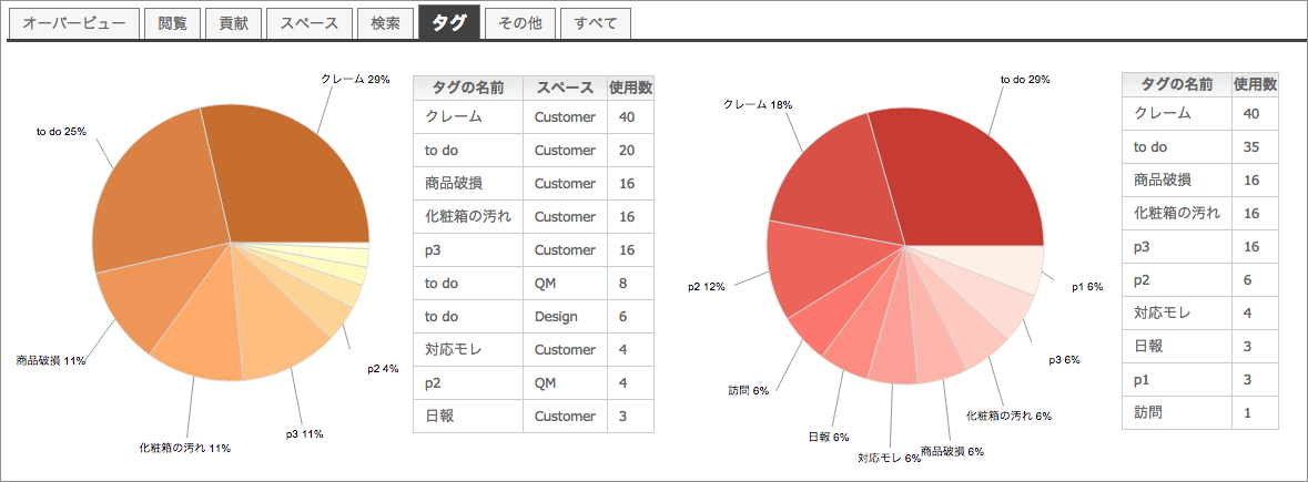 クレームは、必ずしも「クレーム報告」として投稿されるものばかりではありません。例えば、営業マンが日々投稿する「営業日報」に隠れていることもあります。つまり、クレームがいろいろな場所に散在する可能性があるわけです。でも、TeamPage なら大丈夫! 報告場所が違っていても、それが「クレーム報告」でも「営業日報」でも、下図のようにタグで一箇所にまとめられます。