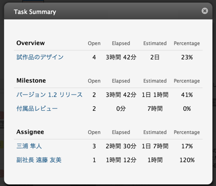 • プロジェクトやマイルストーンのサイドバーからタスクの集計表示ダイアログを表示しできるようになりました。このダイアログには、タスク担当者やマイルストーンごとの仕事量が分かりやすく一覧表示されます。